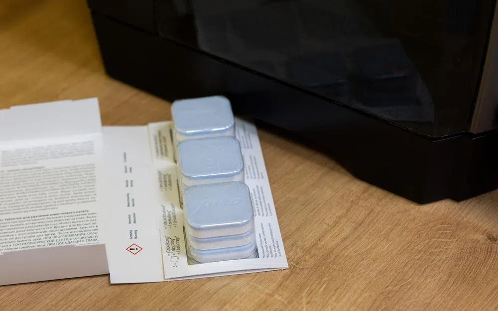 - Odkamieniacz w tabletkach – to wygodne rozwiązanie, zwłaszcza w ekspresach z funkcją samoodkamieniania. Tabletki mają odpowiednio dobraną dawkę środka, dzięki czemu nie trzeba samodzielnie odmierzać ilości preparatu. Rozpuszczają się powoli, co umożliwia dłuższe działanie na osad. Producenci, którzy w swoich ekspresach zalecają to rozwiązanie to np. Jura, Bosch, Siemens.